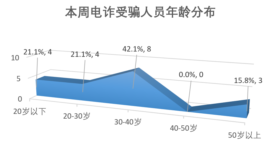 本周,发案数较多的镇街为口岸街道5起,占比26.32%。其余,寺巷街道4起,占比21.05%;凤凰街道3起,占比15.79%;永安洲镇2起,占比10.53%;明珠街道、刁铺街道、大泗镇、野徐镇、医药园区各1起,分别占比5.26%;许庄街道、沿江街道、白马镇、胡庄镇、扬子江工业园为“零发案”。从受骗人员性别看,男性10人,女性9人。从受骗人员年龄看,20岁以下4人,占比21.05%,20-30岁4人,占比21.05%,30-40岁8人,占比42.11%,50岁以上3人,占比15.79%。
