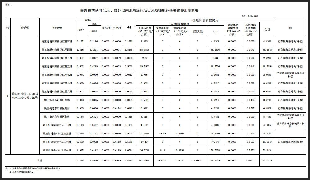 2.泰兴市前汤河以北、S334 以南地块绿化项目地块征地补偿安置费用测算