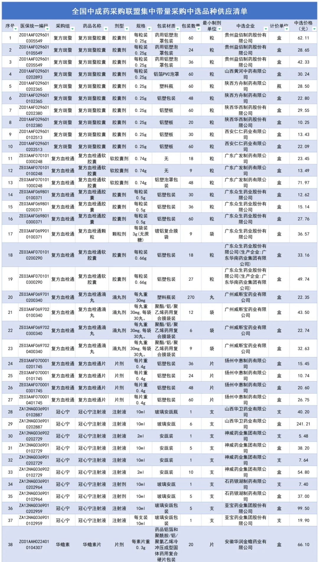 以临床用于抗肿瘤治疗的复方斑蝥胶囊(0.25g)为例,集采前49.8元/盒,集采后13.43元/盒,降价幅度达到73.03%;用于治疗冠心病、心绞痛、心梗等疾病的复方血栓通软胶囊(0.74g*18粒),集采前价格为45.36元/盒,集采后价格降至23.45元/盒,降幅达48.41%