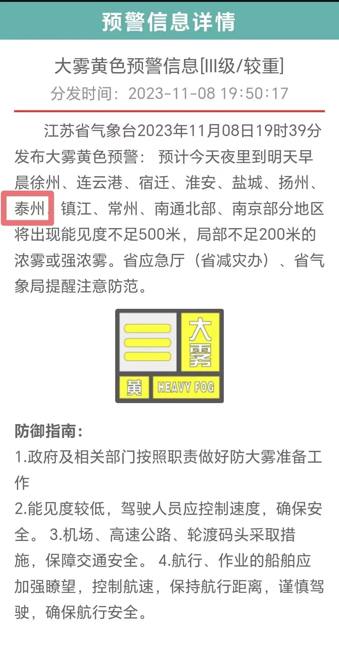 江苏省气象台2023年11月08日19时39分发布大雾黄色预警:预计夜里到早晨徐州、连云港、宿迁、淮安、盐城、扬州、泰州、镇江、常州、南通北部、南京部分地区将出现能见度不足500米,局部不足200米的浓雾或强浓雾。省应急厅(省减灾办)、省气象局提醒注意防范。