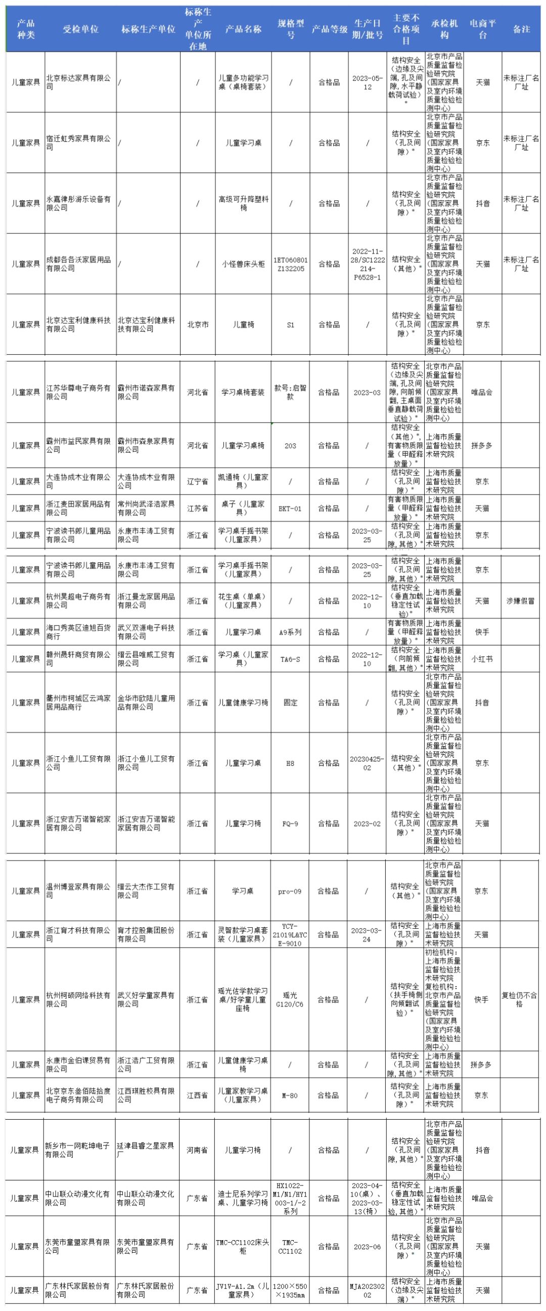 此次共抽查65家销售单位抽查66批次产品,涉及浙江、广东、江苏等12个省份66家生产单位,抽查发现25批次产品不合格。其中,有4批次产品未标注厂名厂址信息,1批次产品涉嫌假冒,已交由属地市场监管部门处理;有23批次产品安全项目结构安全不合格,3批次产品安全项目有害物质限量不合格。