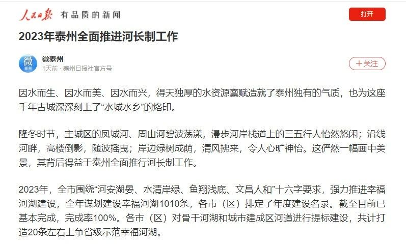 [聚焦民生] 点赞!《人民日报》客户端报道我市全面推进河长制工作