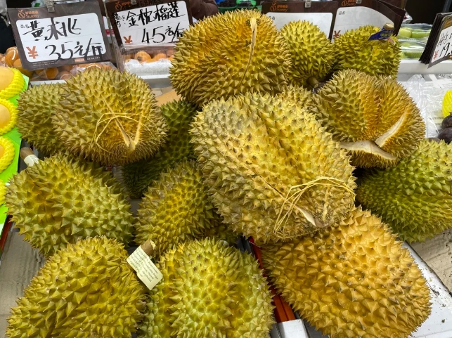 而在某连锁水果店内,榴莲也占了三个货位。泰国金枕榴莲根据品质的高低,分为了35元/斤和45元/斤,店员同样表示,最近价格跌得很快,前几周的金枕榴莲可以卖到60元/斤。
