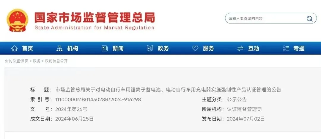 近日 市场监管总局发布公告 对电动自行车车用锂电池和充电器 实施强制性产品认证管理 (下文简称“CCC认证)