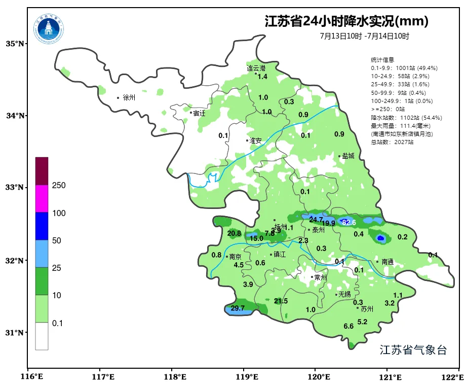 7月14日20时至7月15日20时全省阴有阵雨或雷雨,其中沿江和江淮之间部分地区中雨、局部大到暴雨。最高温度淮河以南地区32~33℃,其他地区31℃左右;最低温度苏南地区25~26℃,其他地区23~24℃。全省偏东风转偏南风,风力都是4级左右,有雷雨地区雷雨时短时阵风7-9级。