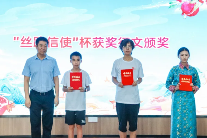 泰州市民宗局副局长吴杰为“丝路信使”杯主题征文活动获奖者代表颁发荣誉证书。