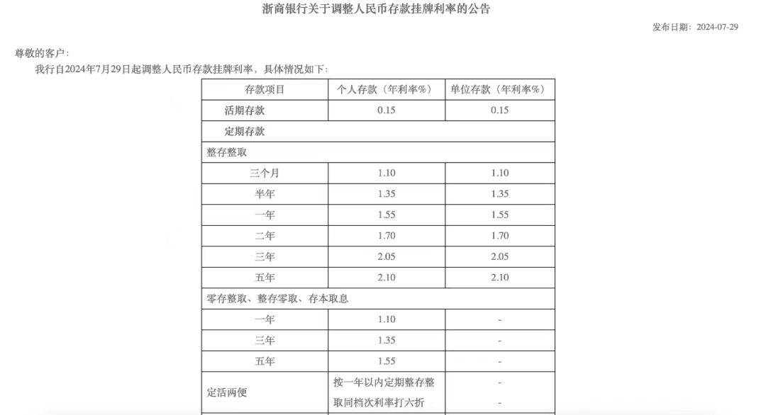 浙商银行一年期、两年期、三年期和五年期人民币定期存款利率分别降至1.55%、1.70%、2.05%、2.10%。