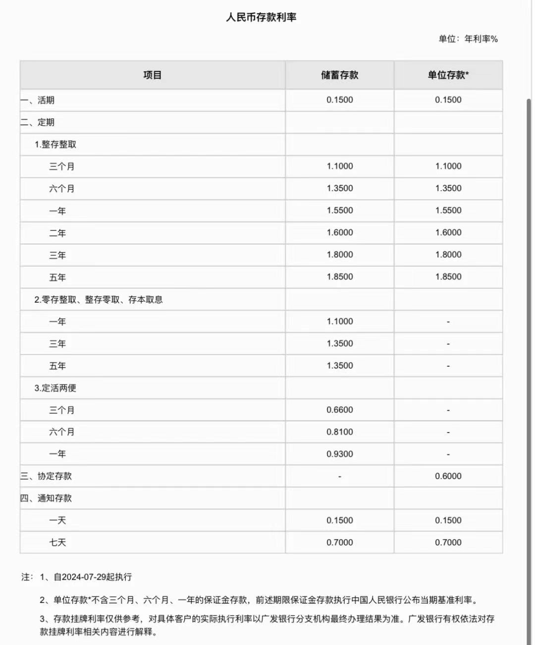 广发银行一年期、两年期、三年期和五年期人民币定期存款利率分别降至1.55%、1.60%、1.80%、1.85%。