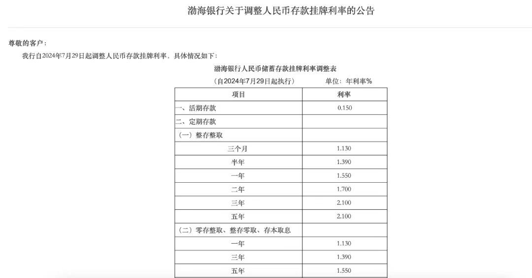 渤海银行一年期、两年期、三年期和五年期定期存款利率分别降至1.55%、1.70%、2.10%、2.10%。