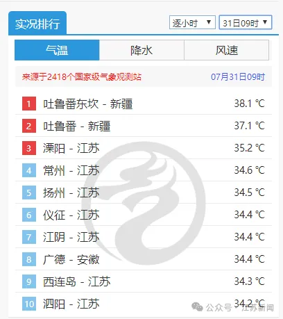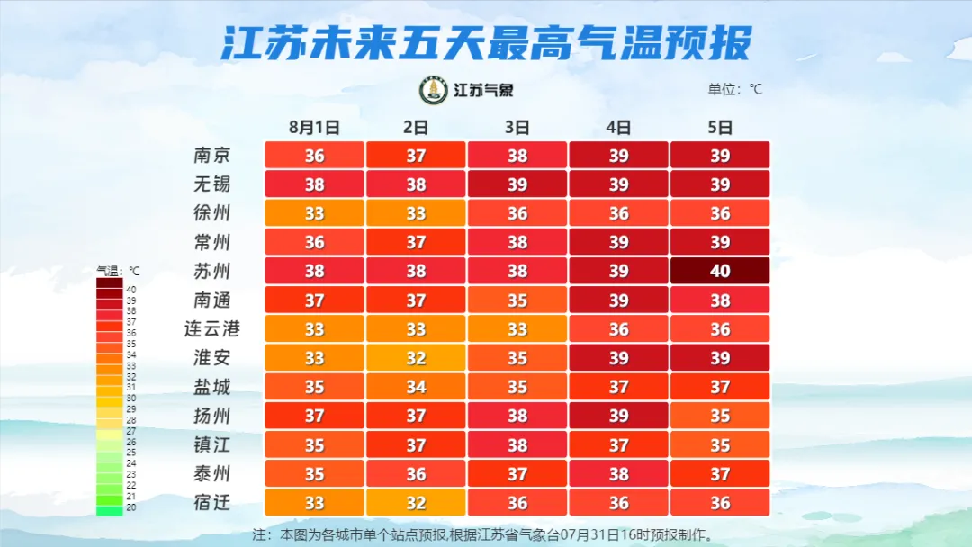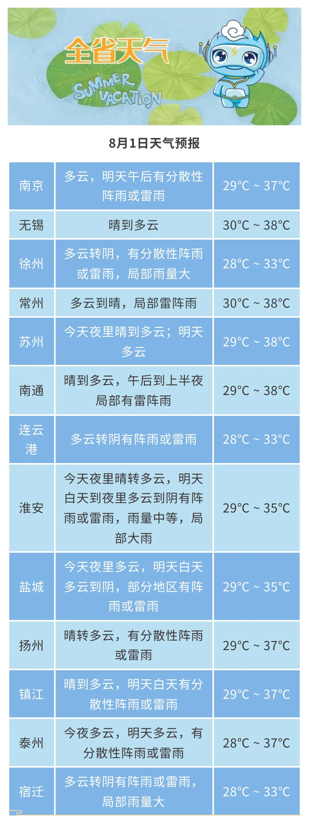 8月1日20时到8月2日20时:江淮之间北部和淮北地区多云到阴有阵雨或雷雨,局部雨量大,其他地区多云到晴。最高温度淮北地区33℃左右,沿江和苏南地区37~38℃,其他地区34~35℃;最低温度淮北北部地区27℃左右,其他地区28~29℃。全省偏南风4级左右,有雷雨地区雷雨时短时阵风7-9级。