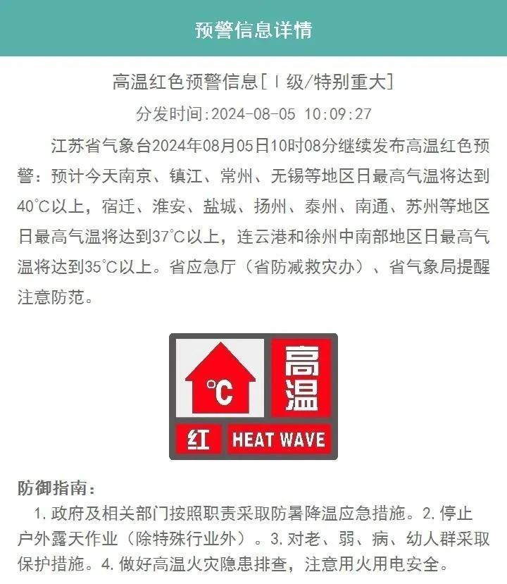江苏省气象台 8月5日10时08分继续发布 高温红色预警