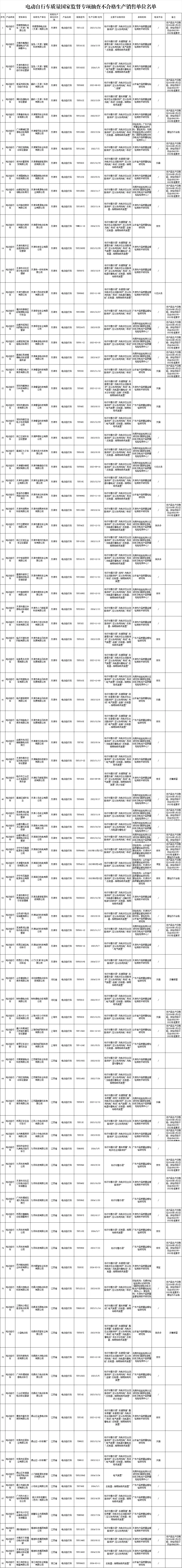 记者梳理名单发现,146批次不合格电动自行车中,有5批次为爱玛,涉及问题包括标识与警示语、充电状态主回路保护、互认协同充电、布线、反射器、照明和鸣号装置、充电器与蓄电池;7批次为九号,涉及问题包括标识与警示语、整车质量、充电状态主回路保护、互认协同充电、布线;6个批次为绿源,涉及问题包括标识与警示语、整车质量、充电状态主回路保护、互认协同充电、布线、反射器、照明和鸣号装置;2个批次为小牛,涉及问题为标识与警示语、充电状态主回路保护、互认协同充电;3个批次为雅迪,涉及问题为标识与警示语、充电状态主回路保护、互认协同充电。此外,不合格电动自行车还涉及小刀、宝岛、小鸟、新日、永久等多个品牌。