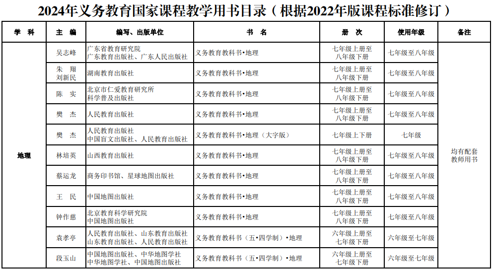 以下是教育部公布的2024年义务教育国家课程教学用书目录(根据2022年版课程标准修订)