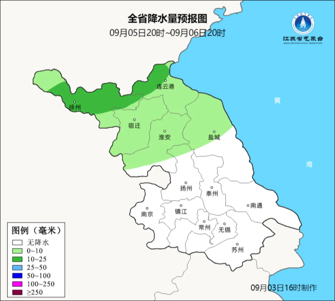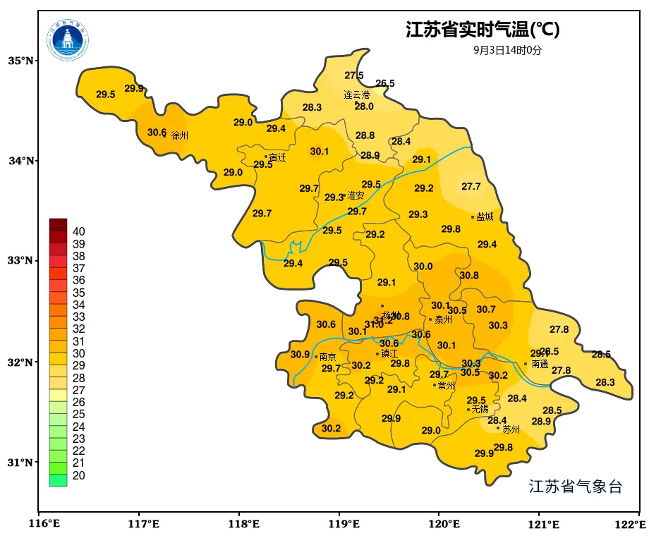沿淮和淮北地区阴有阵雨或雷雨,部分地区雨量中等,其他地区多云到晴。最高温度:沿江和苏南地区33~34℃,淮北北部27~28℃,其他地区30℃左右;最低温度:淮北北部23℃左右,其他地区24~25℃。全省偏东风4-5级阵风6级,有雷雨地区雷雨时短时阵风7-9级。