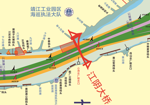 江阴大桥附近至老十圩港上行推荐航路、#62黑浮北侧新扬子长博造船厂与正龙码头之间水域。