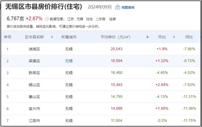 近一月无锡二手房均价16329元/㎡,挂牌均价最高的是滨湖区为20043元/㎡,新增房源6767套
