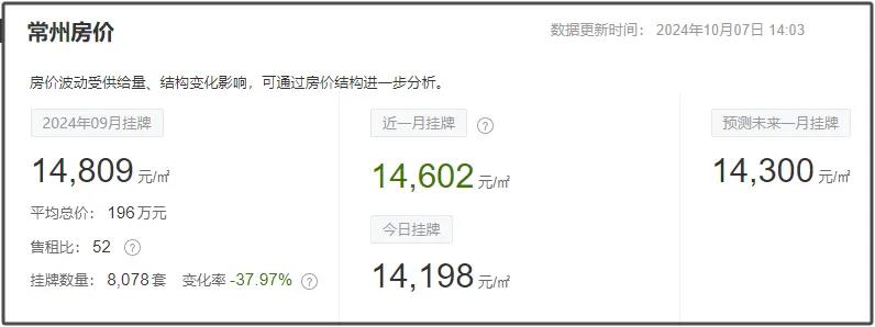 目前常州二手房均价14809元/㎡,挂牌均价最高的是天宁区为18264元/㎡,新增房源8078套。