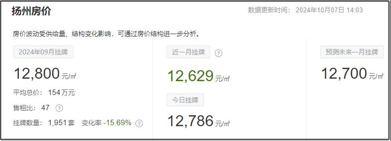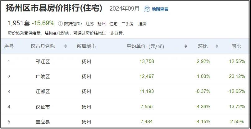 近一月扬州二手房均价12800元/㎡,挂牌均价最高的是邗江区为13758元/㎡,新增房源1951套。