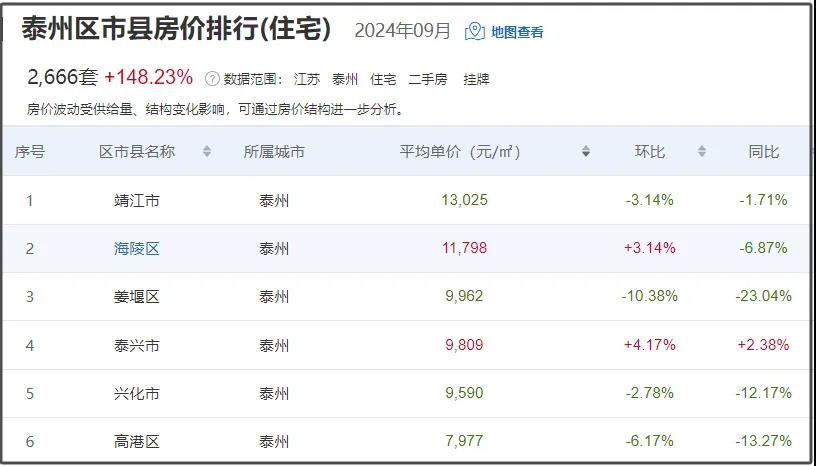 从具体区域来看,2个区域房价环比上月呈现上涨趋势,4个区域房价呈现下跌趋势,姜堰区降幅最高,降幅10.38%。