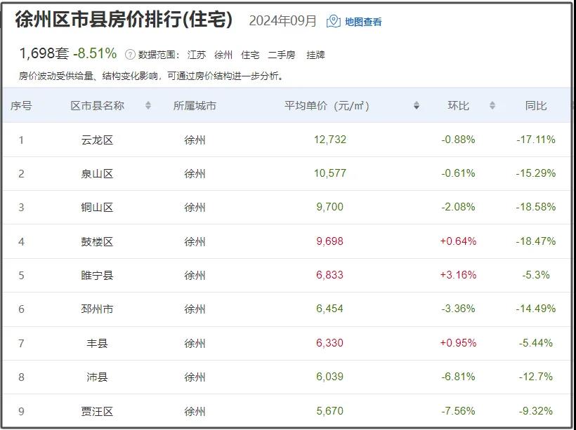 从具体区域来看,3个区域房价环比上月呈现上涨趋势、6个区域房价呈现下跌趋势,贾汪区降幅最高,降幅7.56%。