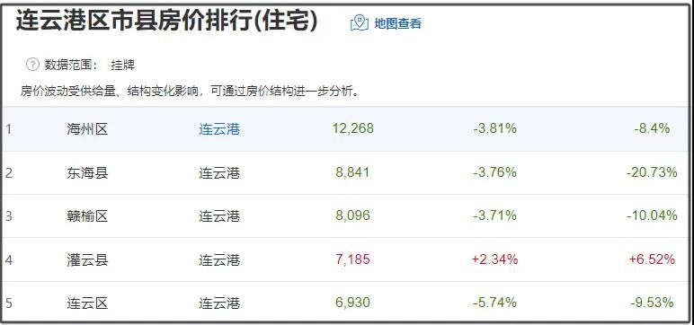 从具体区域来看,1个区域房价呈现上涨趋势,4个区域房价呈现下跌趋势,连云区降幅最高,降幅5.74%。