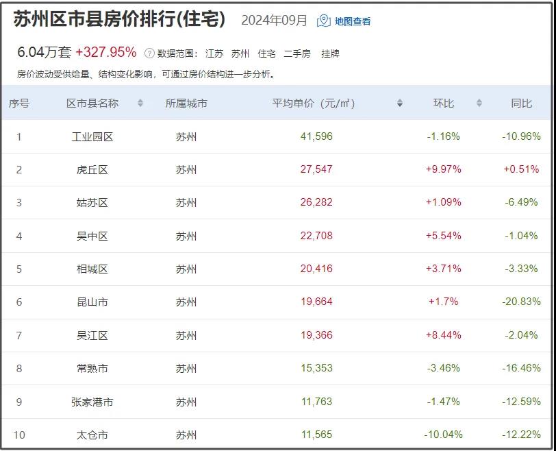 目前苏州二手房均价25724元/㎡,挂牌均价最高的是工业园区为41596元/㎡,新增房源6.04万套。