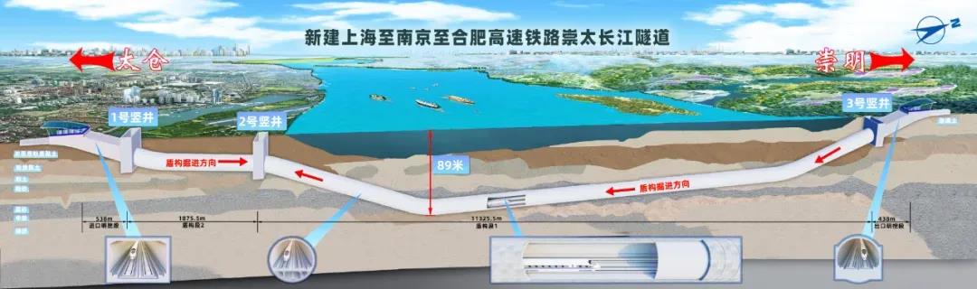 崇太长江隧道连接上海市崇明区和江苏省太仓市,隧道全长14.25千米,其中盾构段长13.2千米,采取单洞双线设计,是目前世界高铁隧道独头掘进距离最长(11325.5米)、盾构直径最大(15.4米)、过江设计时速最高(350公里/小时)、长江水下最深(89米)的工程。项目建成运营后,将实现高铁穿越长江不减速的壮举。