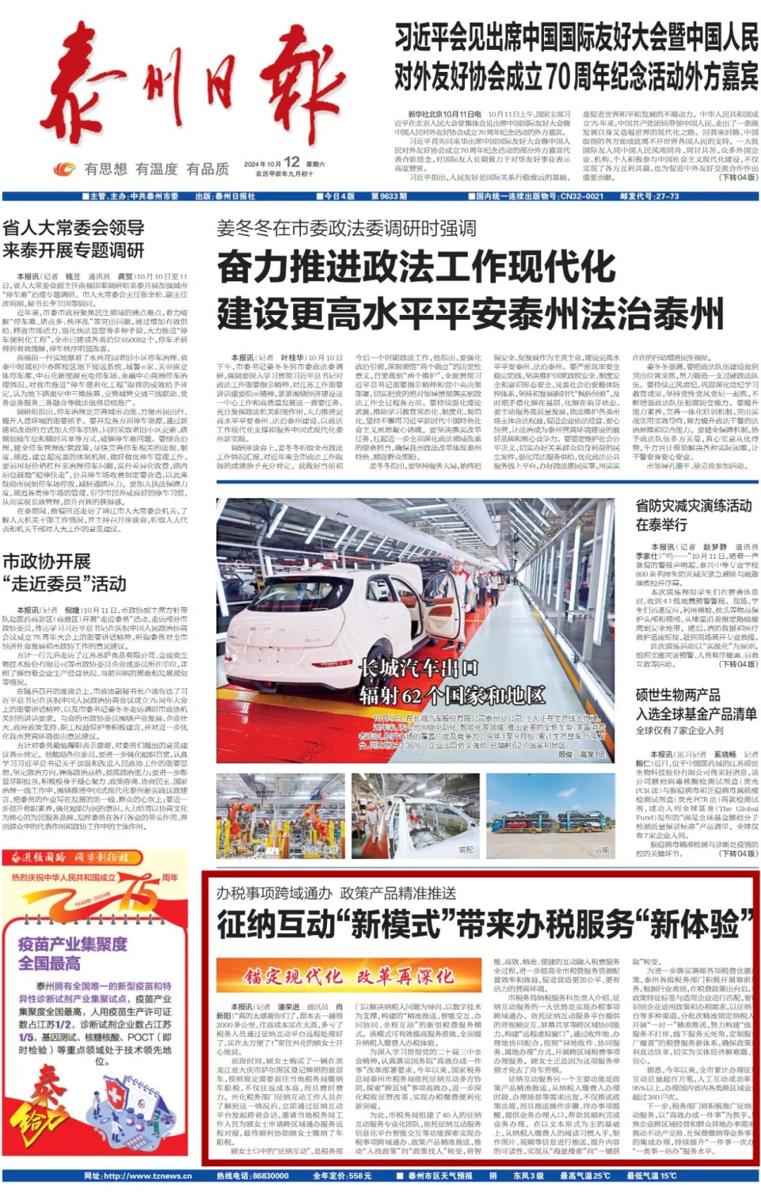 [聚焦民生] 泰州日报头版:办税事项跨域通办 政策产品精准推送 征纳互动“新模式”带来办税服务“新体验”