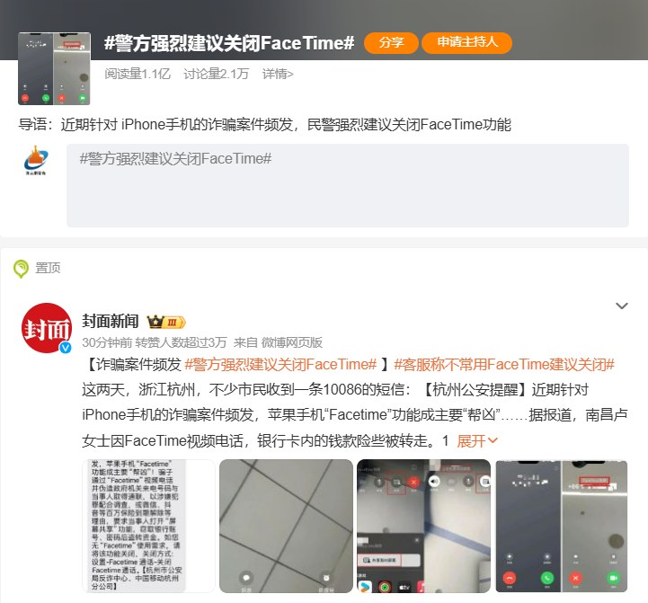 10月28日 话题#警方强烈建议关闭FaceTime# 冲上微博热搜第一 引发网友关注