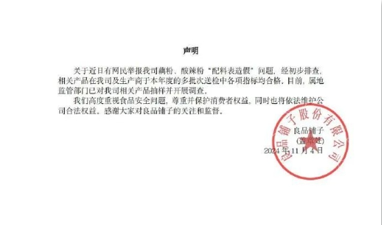 11月4日下午,良品铺子官微发声明回应:关于近日有网民举报我司藕粉、酸辣粉“配料表造假”问题,经初步排查相关产品在我司及生产商于本年度的多批次送检中各项指标均合格。目前,属地监管部门已对我司相关产品抽样并开展调查。我们高度重视食品安全问题,尊重并保护消费者权益,同时也将依法维护公司合法权益,感谢大家对良品铺子的关注和监督。