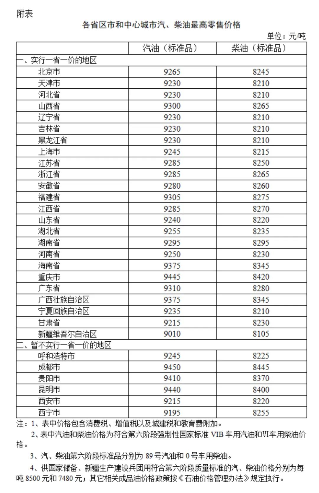 附:各省区市和中心城市汽、柴油最高零售价格