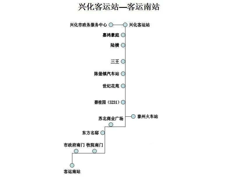 专线新增市政府南门、牧院南门、东方名邸、苏北商业广场等站点,一路串联起工作圈、商圈、社区、医院等,为满足部分旅客直达出行的个性化诉求,专线开设了6条直达班线,全程只保留汽车南站、泰州火车站、兴化客运站3个站点。