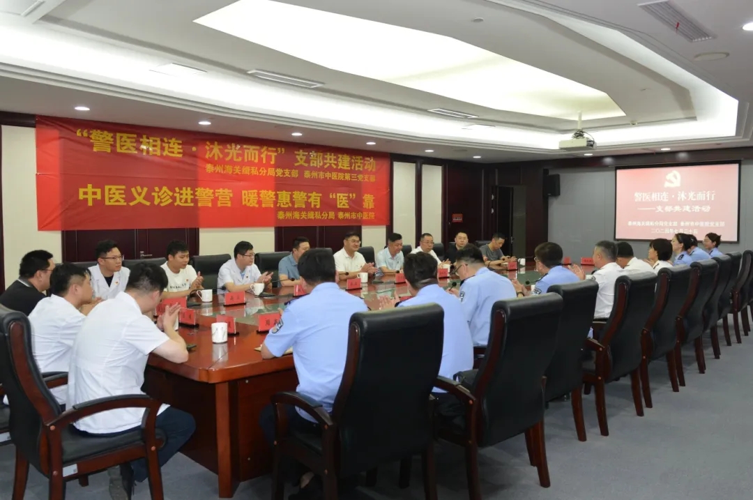 为深化警医合作,做实爱警、暖警服务,7月30日下午,结合江苏省中医药文化服务月暨泰州市健康促进“十千百万工程”行动推进,泰州市中医院中医专家团队走进泰州海关缉私分局,开展以“警医相连·沐光而行”为主题的党建联建活动。通过党的二十届三中全会精神学习、健康讲座、中医义诊等特色服务,共同擦亮党建品牌,提升缉私民警辅警繁忙工作之余的健康指数。