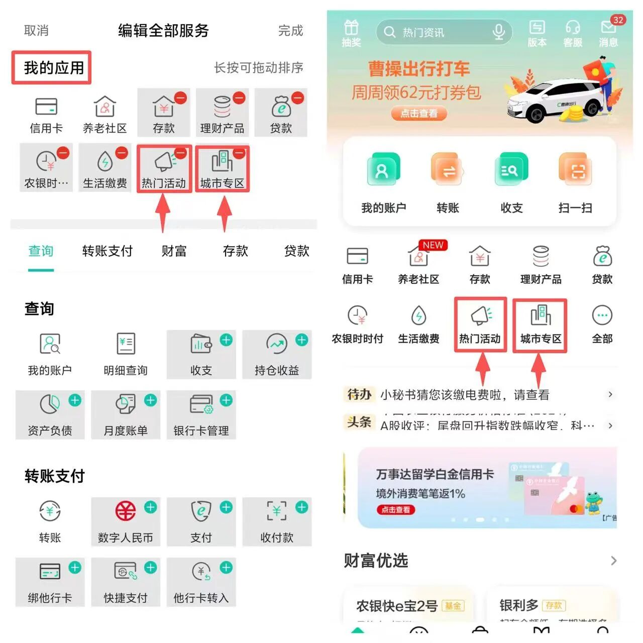 好消息 农业银行泰州分行 给大家送福利啦! 最高200元立减金 每日限量早茶优惠券等 多重好礼 大家快来农行掌银扫码 参与吧! 为方便大家快速参与活动 可将掌银的 “热门活动”“城市专区”模块 添加到首页快捷入口 福利一键直达