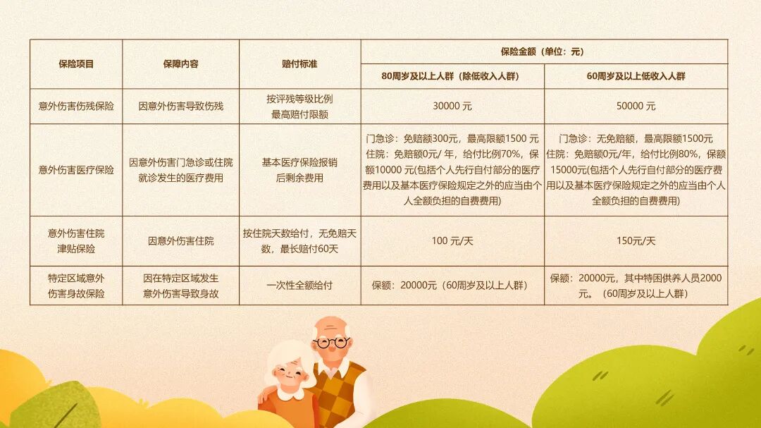 (1)特定区域意外伤害身故保险的参保对象:60周岁及以上所有人群(不限低收入人群)、民政局组织活动邀请的参加人员;