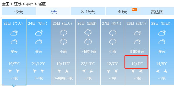 泰州市气象台3月23日6时发布的天气预报:今天多云,东南风3到4级,今天最高气温18到19℃,明晨最低气温5到6℃;24日白天多云,夜里多云转阴有阵雨,5到21℃;25日阴有阵雨或雷雨,雨量中等,11到18℃。