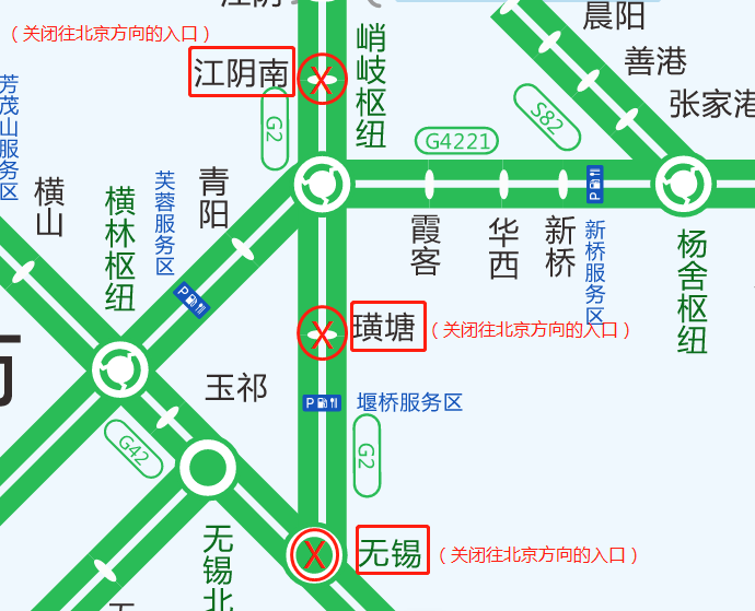 G2京沪高速江阴大桥段由上海往北京方向1095K至1065K无锡枢纽至江阴收费站附近由于施工养护,现场交通单向中断,关闭江阴南、璜塘、无锡往北京方向入口,封闭G42沪蓉高速无锡枢纽双向转G2京沪高速北京方向匝道(备注:G42沪蓉高速双向车辆可从无锡收费站下高速),封闭G4221沪武高速峭岐枢纽双向转G2京沪高速北京方向匝道(备注:G4221沪武高速往武汉方向可从江阴南收费站下高速),施工时间:2022年5月11日至2022年6月10日。