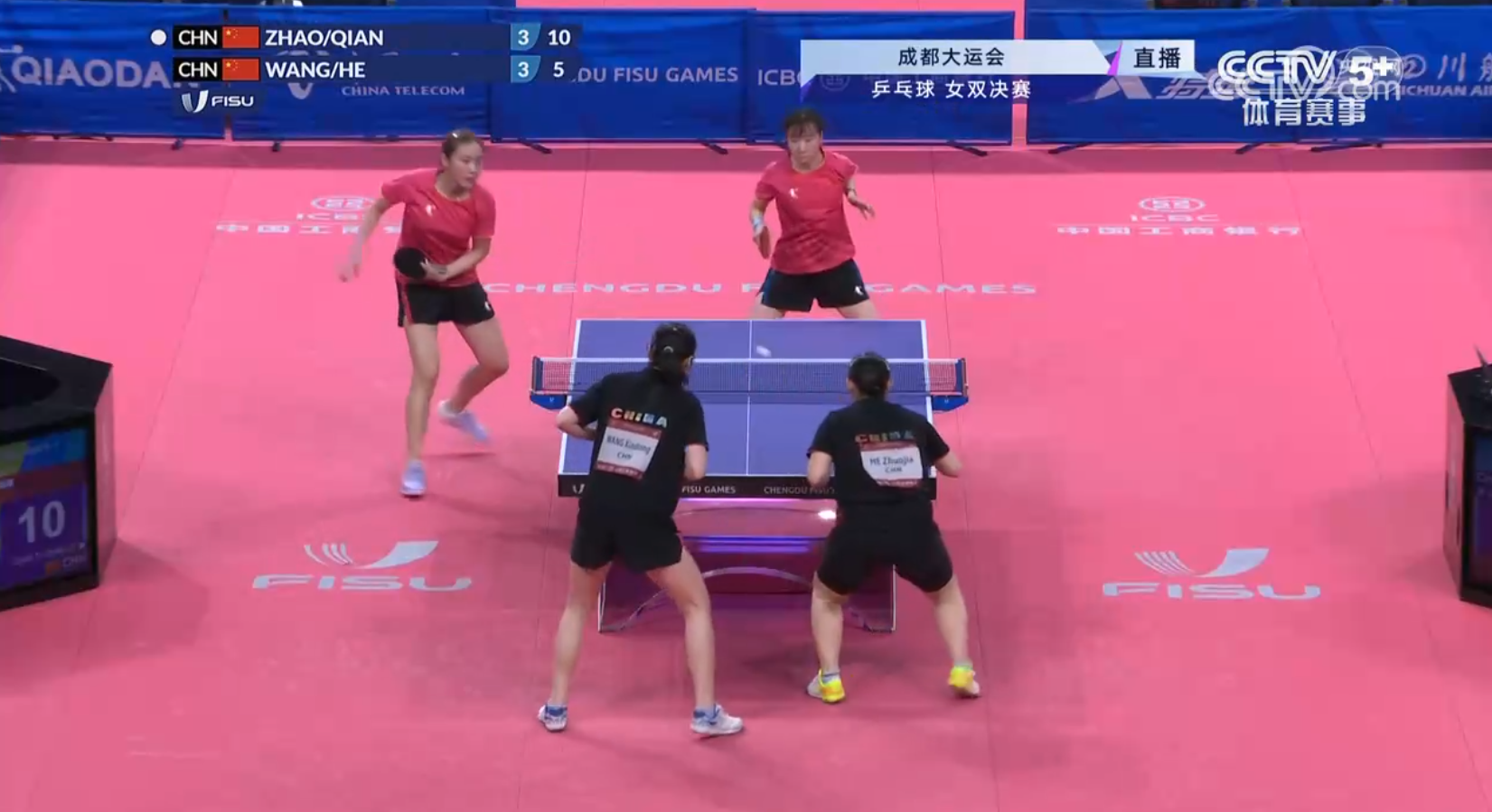 在乒乓球女子双打决赛中钱天一/赵尚以4比3战胜队友何卓佳/王晓彤获得女双冠