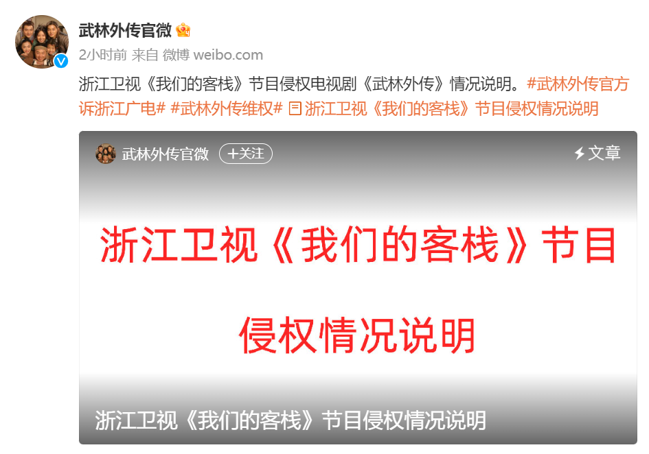 人民日报客户端消息,8月27日,武林外传官方@武林外传官微 发布声明称,浙江卫视综艺节目《我们的客栈》在未获得任何官方授权的前提下上线,使用大量《武林外传》的版权元素用于节目改编,属于故意侵权、恶意侵权。