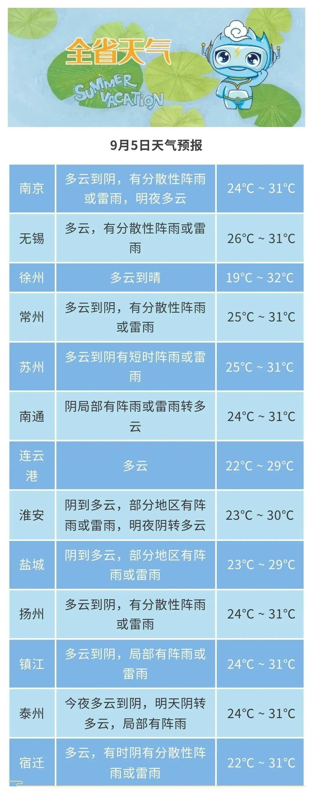 在台风“海葵”登陆的过程当中,受其外围影响,江苏淮河以南9月4-5日阴有阵雨或雷雨,本周好天气为主场,周后期7-10日,全省晴到多云天气为主,不过要注意今明两天,我省淮河以南大部分地区将伴有阵雨或雷雨。此外,气温方面变化平稳,无高温天气,最高气温全省30℃左右。