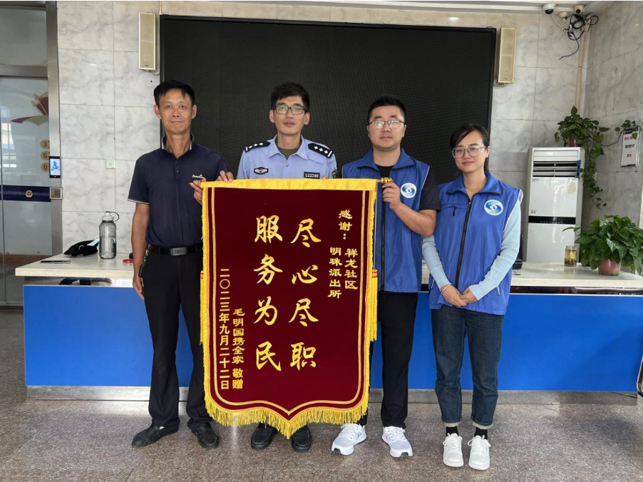 将一面印有“尽心尽职 服务为民”字样的锦旗