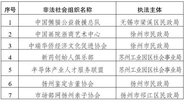 为提高公众防范意识,谨防上当受骗,现向社会集中通告公布江苏民政部门依法取缔的4家以及涉嫌的7家非法社会组织名单(2023年第二批)。社会公众如果发现名单中被依法取缔的非法社会组织仍在开展活动的,可依法向公安机关报案;如果发现公布为涉嫌非法社会组织开展活动的线索,可向相关民政部门进行举报。