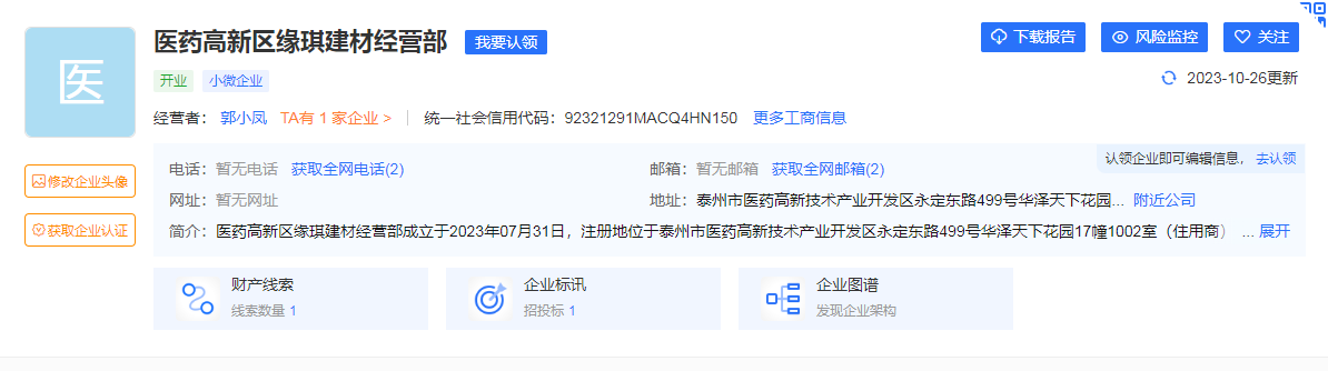 泰州医药高新区(高港区)行政审批局于2023年10月24日收到朱珂琪提交的情况说明,反映郭小凤在其不知情的情况下,委托尚海华在2023年7月31日,向登记机关提交虚假租赁协议,将其位于泰州市永定东路499号华泽天下花园17幢1002室的房屋登记为医药高新区缘琪建材经营部的经营场所。