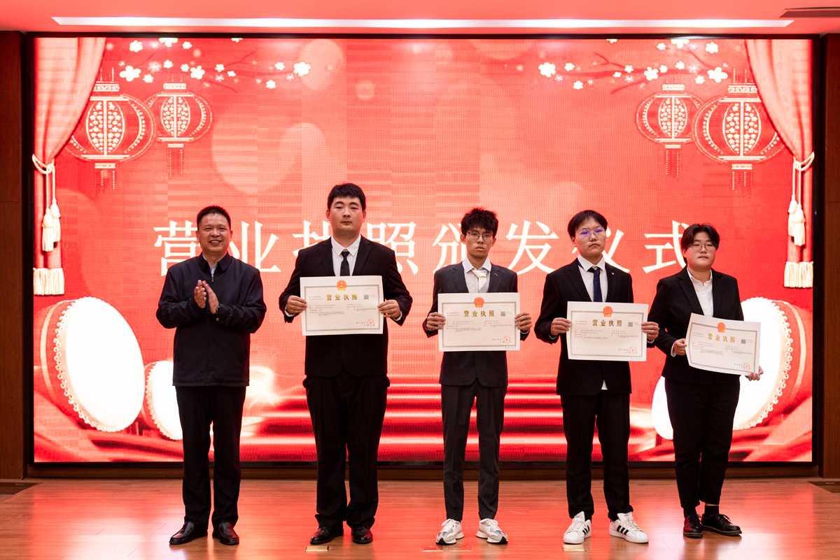 现场为创业大学生颁发营业执照