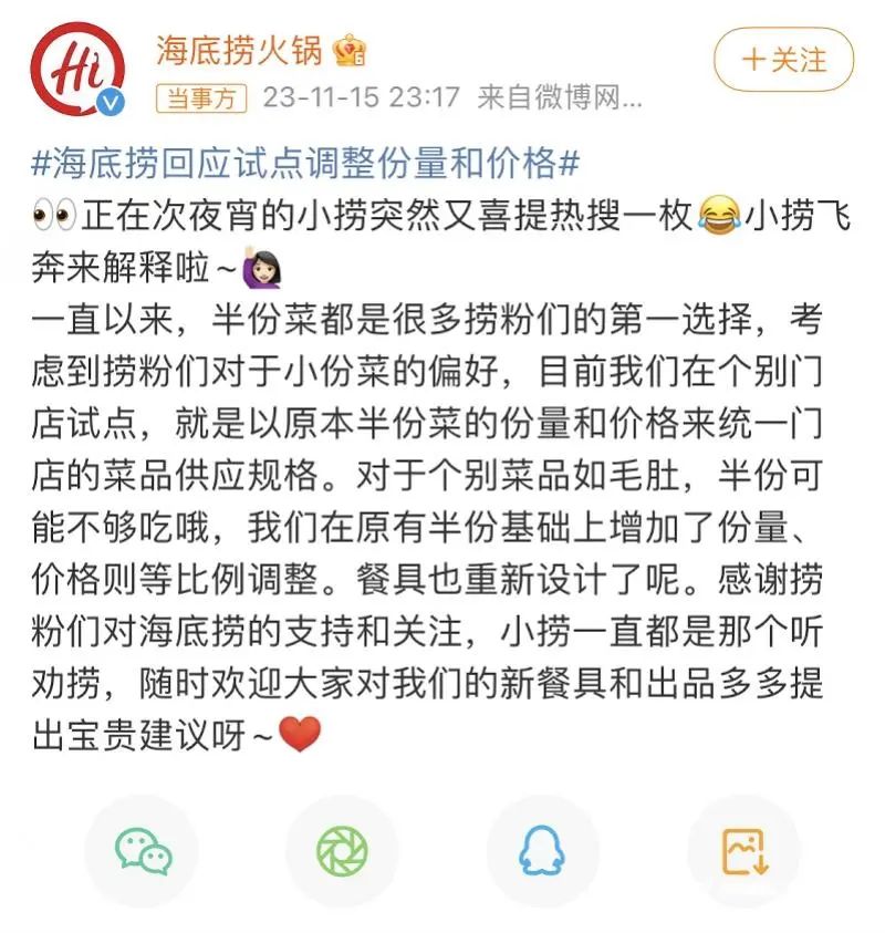 近日,有消费者发帖称,海底捞西安、北京的部分门店点餐时不再提供“半份”和“整份”的选项,而是统一变成“一份”。11月15日晚间,海底捞官方微博曾公开回应称,在个别门店以原本半份菜的份量和价格来统一门店的菜品供应规格,随之#海底捞回应试点调整分量和价格#冲上热搜。