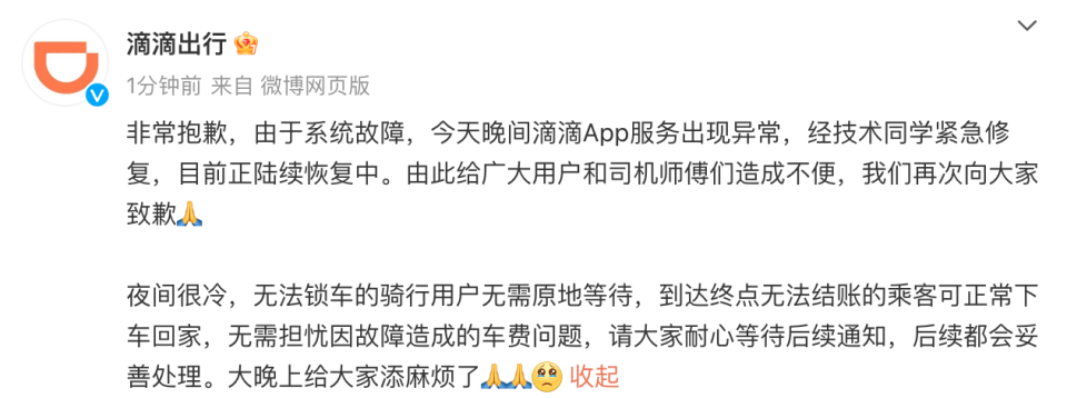 对此,@滴滴出行 回应称,非常抱歉,由于系统故障,今天晚间滴滴App服务出现异常,经技术同学紧急修复,目前正陆续恢复中。无法锁车的骑行用户无需原地等待,到达终点无法结账的乘客可正常下车回家,无需担忧因故障造成的车费问题,请大家耐心等待后续通知,后续都会妥善处理。