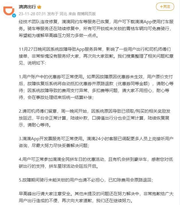 11月28日早间,滴滴出行官方微博发文称,经技术团队连夜修复,滴滴网约车等服务已恢复。骑车等服务还在陆续修复中,所有可开锁或未关锁的青桔车辆均可免费骑行。