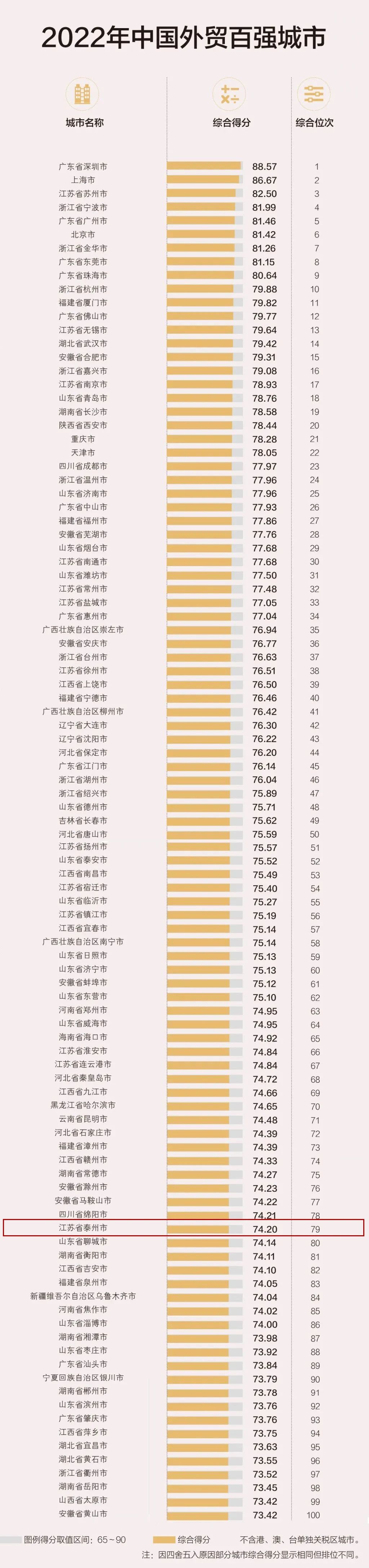 近日 海关总署官方微信 发布2022年中国外贸百强城市 泰州同样榜上有名 位居第79位