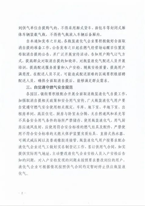 日前 泰州医药高新区(高港区)城镇燃气 和城市地下管网安全生产专业委员会 发布通知表示 自2024年6月1日起 医药高新区(高港区) 各瓶装液化气充装站、供应站点 原则上取消瓶装液化气自提购气 统一由送气服务人员将气瓶配送到户 并实行免费入户安检和安全用气指导