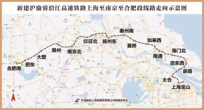 北沿江高速铁路,即上海至南京至合肥高速铁路(沪渝蓉高速铁路上海至合肥段),起自上海市上海宝山站,经江苏省苏州市、南通市、泰州市、扬州市、南京市及安徽省滁州市、合肥市,接入合肥南站,正线长度553.762公里,设计速度350公里/小时,全线设16座车站。在泰州境内里程约52公里,涉及泰兴市、姜堰区、医药高新区(高港区) 3个市 (区)。